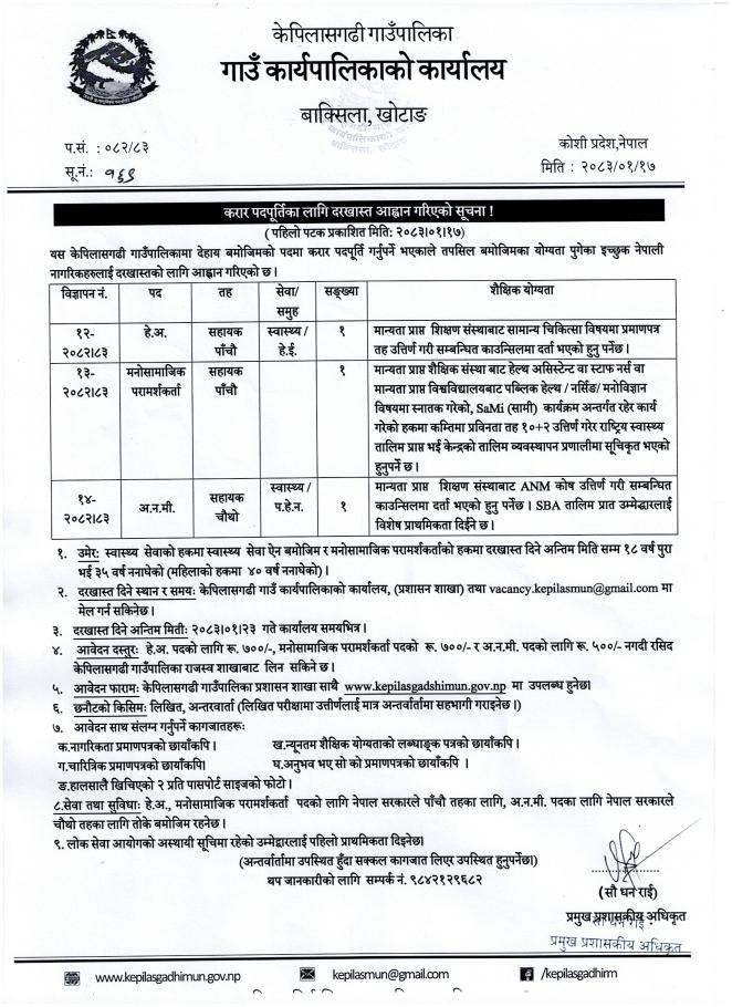करार पदपूर्तिका लागि दरखास्त आह्वान गरिएको सूचना !!!