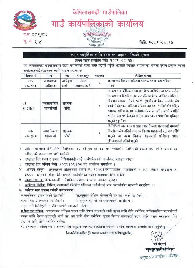 करार सेवामा पदपूर्तिको लागि दरखास्त आह्वान गरिएको सूचना !!!